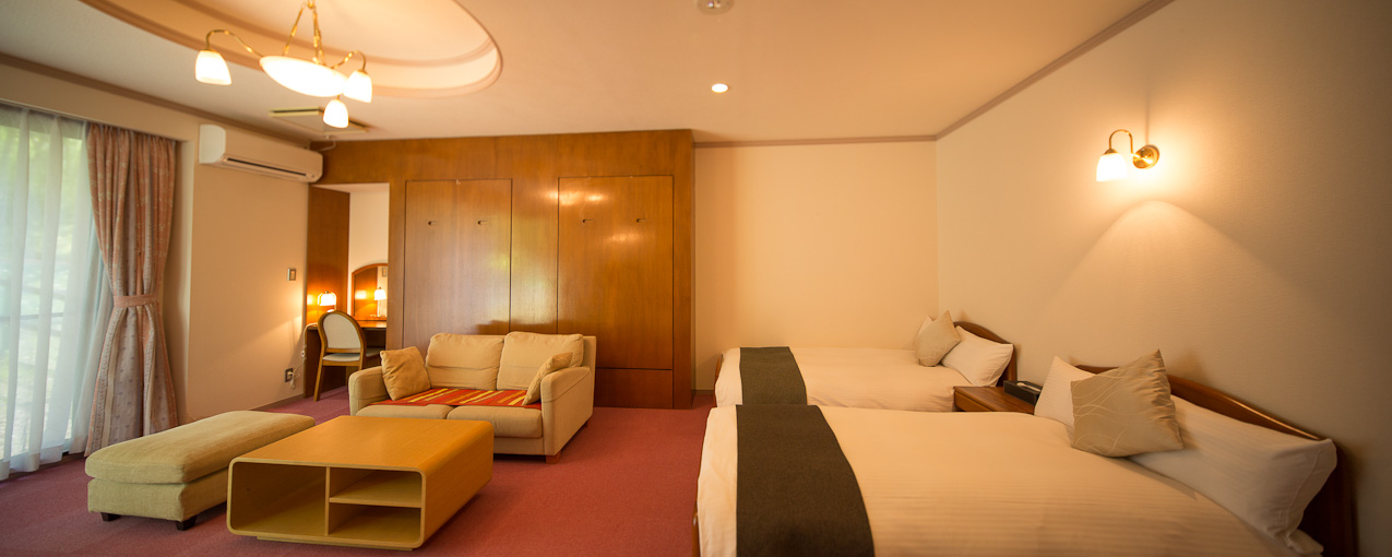 北軽井沢リーオの本館には3つのタイプの客室があり、それぞれ本館1階のデラックスルーム、本館2階のスタンダードB、本館3階のスタンダードCがあります。デラックスは4名様まで、スタンダードBは2名様まで、スタンダードCは3名様までお泊りになれます。